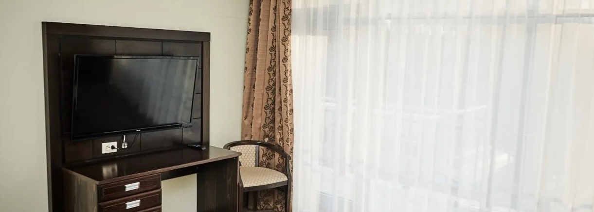 В номере: багажная тумба, зеркало, двуспальная кровать, тумбы, стулья, шкаф-купе, телевизор, светильник, электронные замки, Wi-Fi, телефон